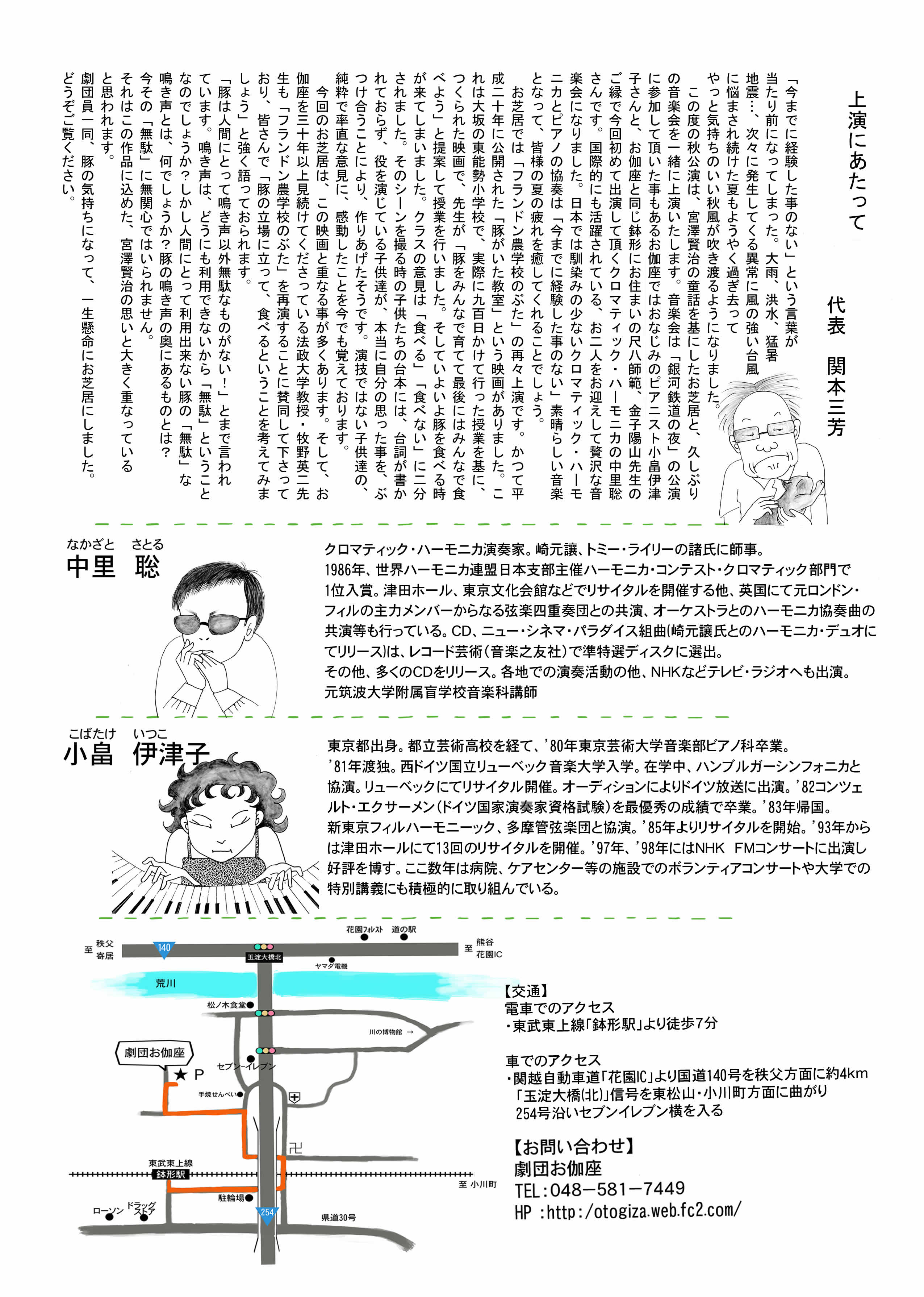 お伽座が旗揚げ公演より取り組んでいる宮澤賢治の寓話より「フランドン農学校のぶた」と、クロマテック・ハーモニカとピアノによる音楽会を2部構成で上演します。